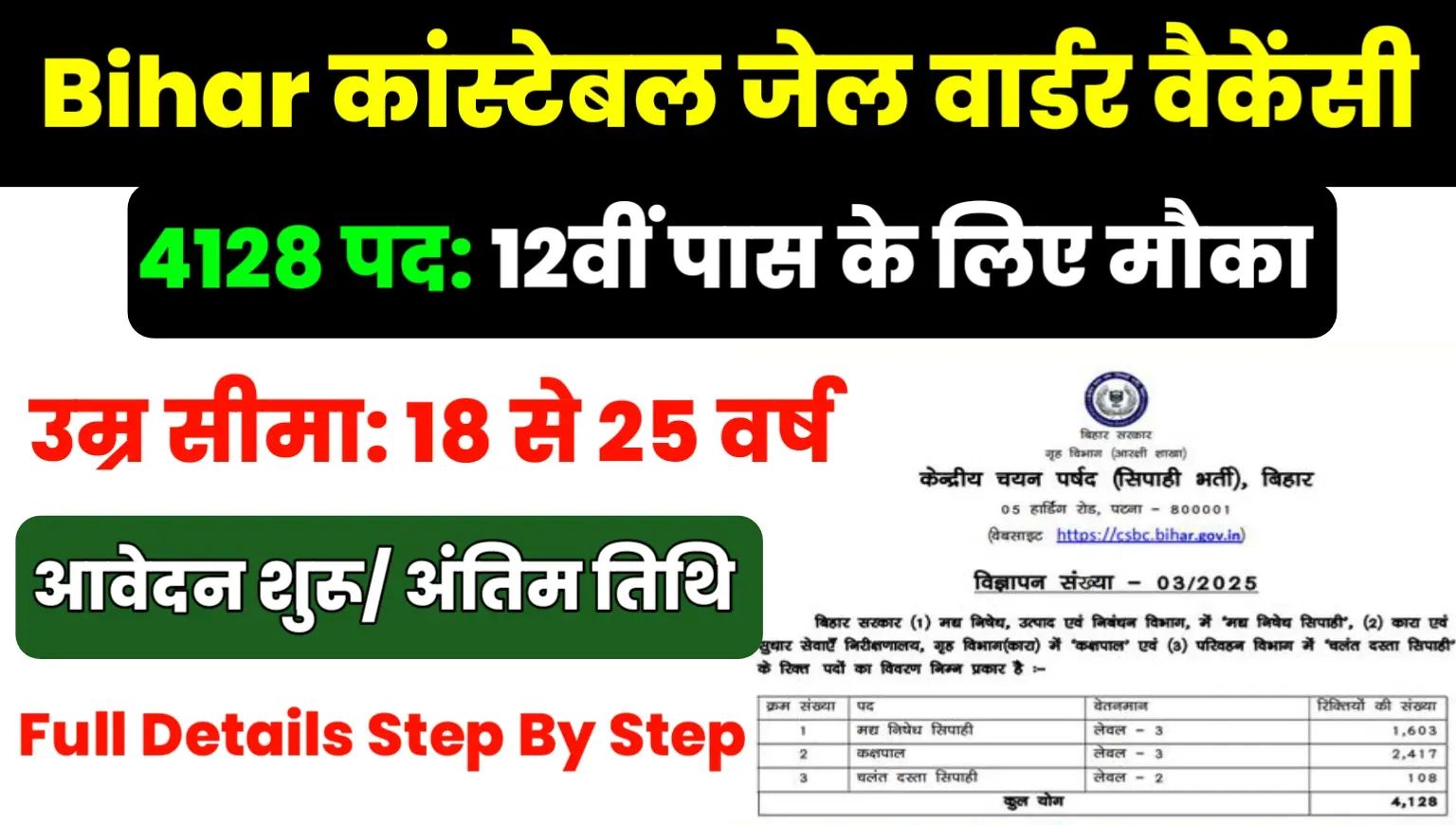 Bihar Constable Jail Warder Vacancy 2025: बिहार में सरकारी नौकरी की तैयारी कर रहे युवाओं के लिए खुशखबरी है। अगर आप सुरक्षा सेवा या जेल सेवा में नौकरी की तलाश कर रहे हैं, तो यह आपके लिए सुनहरा मौका आ गया है। बता दें CSBC ने Bihar Constable / Jail Warder / Prohibition / Mobile Squad Constables के लिए भर्ती अधिसूचना जारी कर दिया है। इस बार कुल 4128 पदों पर बड़ी भर्ती होने जा रही है।