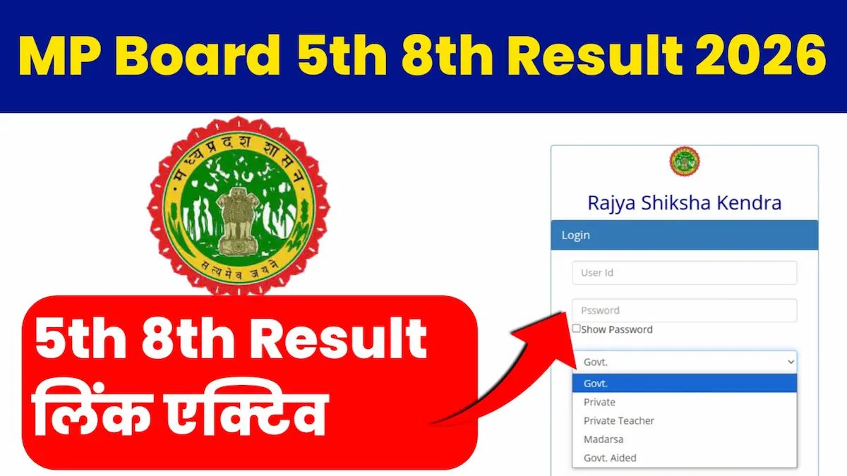 एमपी बोर्ड कक्षा 5वीं, 8वीं के छात्र या उनके अभिभावकों को को बता दें कि मध्य प्रदेश माध्यमिक शिक्षा बोर्ड अब कभी भी किसी भी समय 5th, 8th Class Result 2026 MP जारी कर सकता है। हालांकि बोर्ड ने रिजल्ट की तारीख और समय की घोषणा नहीं की है लेकिन सभी तैयारियां लगभग पूरी हो चुकी हैं। एक बार रिजल्ट का लिंक आधिकारिक वेबसाइट पर एक्टिव होते ही आप रोल नंबर व जन्मतिथि की मदद से चेक कर सकते हैं। हालांकि यहां नीचे रिजल्ट चेक करने का बिल्कुल आसान तरीका व डायरेक्ट लिंक भी उपलब्ध है यहां से भी आसानी से चेक किया जा सकता है।