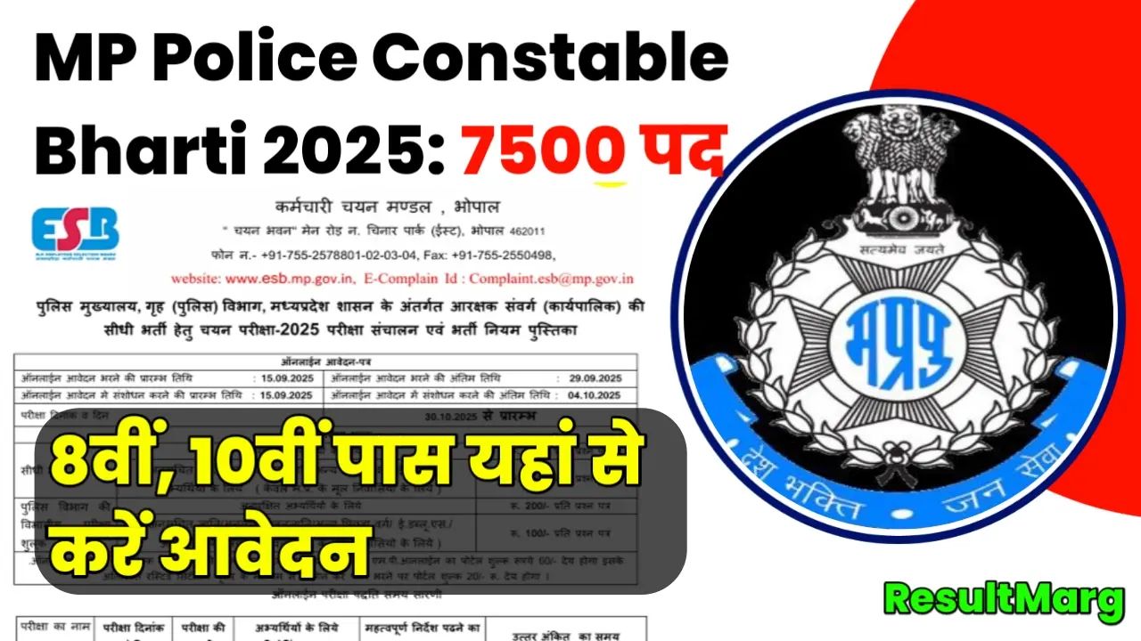 MP Police Constable Bharti 2025: अगर आप पुलिस की नौकरी का सपना देखते हैं और लंबे समय से तैयारी कर रहे हैं, तो आपके लिए बड़ी खुशखबरी है। मध्य प्रदेश कर्मचारी चयन मंडल (MPESB) ने MP Police Constable Recruitment 2025 का नोटिफिकेशन जारी कर दिया है। इस भर्ती के तहत 7500 पदों पर कॉन्स्टेबल की सीधी भर्ती होने जा रही है। अगर आप योग्य एवं इच्छुक हैं तो आधिकारिक वेबसाइट esb.mp.gov.in पर जाकर ऑनलाइन आवेदन कर सकते हैं।
