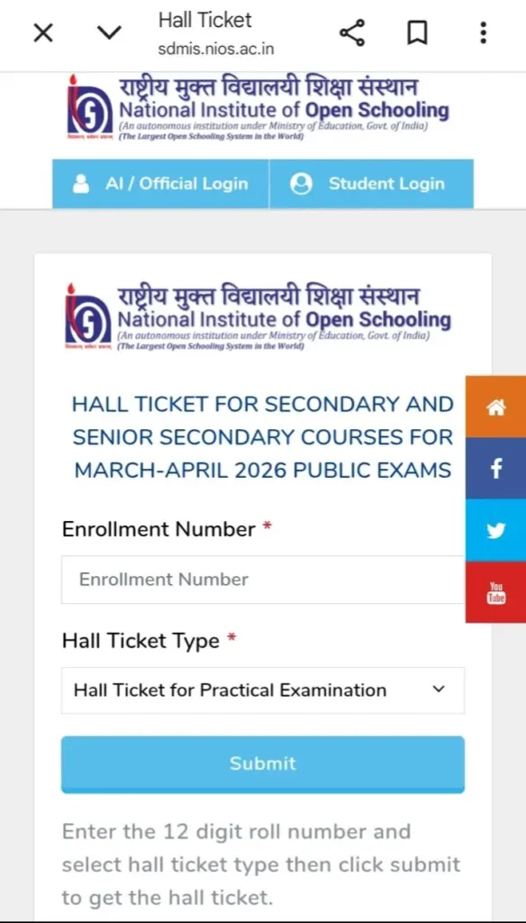 | एडमिट कार्ड डाउनलोड करने की आधिकारिक वेबसाइट | https://sdmis.nios.ac.in/ |